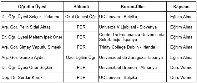 Eğitim Fakültemizin 7 öğretim üyesi 2024 Proje dönemleri kapsamında açılan Erasmus Personel Hareketliliği programına katılamaya hak kazandılar. Öğretim üyelerimizin isimleri ve gidecekleri üniversiteler şu şekildedir: